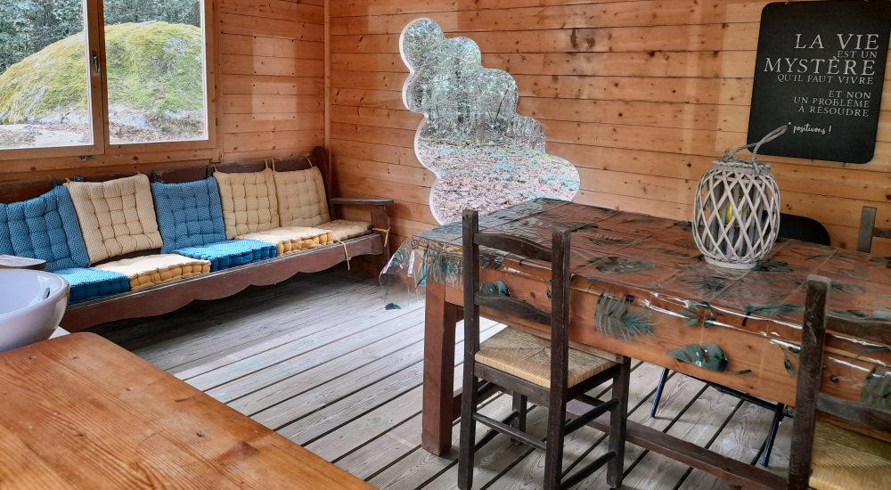 Un lieu commun pour se réunir, partager et se divertir. La cabane commune sert de plateforme pour le diner ou le déjeuner des locataires.