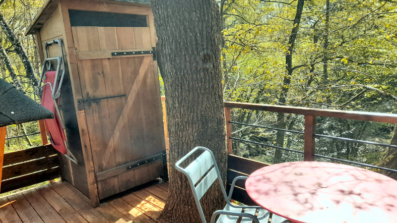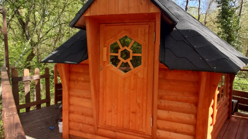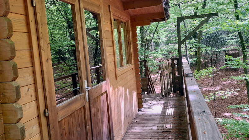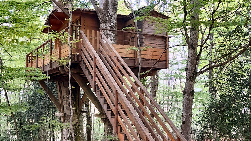 Cabane de 12m² avec terrasse de 20m² équipée de bain de soleil et salon de jardin.Elle est construite à plus de 4m du sol entre deux magnifiques hêtres centenaires qui vous offre une vue magnifique sur le bois et ses occupants.