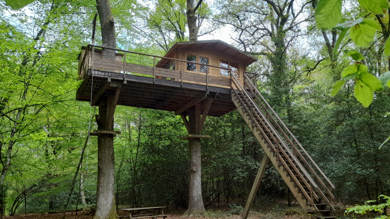 Cabane de 12m² avec terrasse de 20m² équipée d'un salon de jardin.Construite à 7m de haut autour de deux chênes, elle permet l'obsevation de toute la faune et la flore de la forêt.