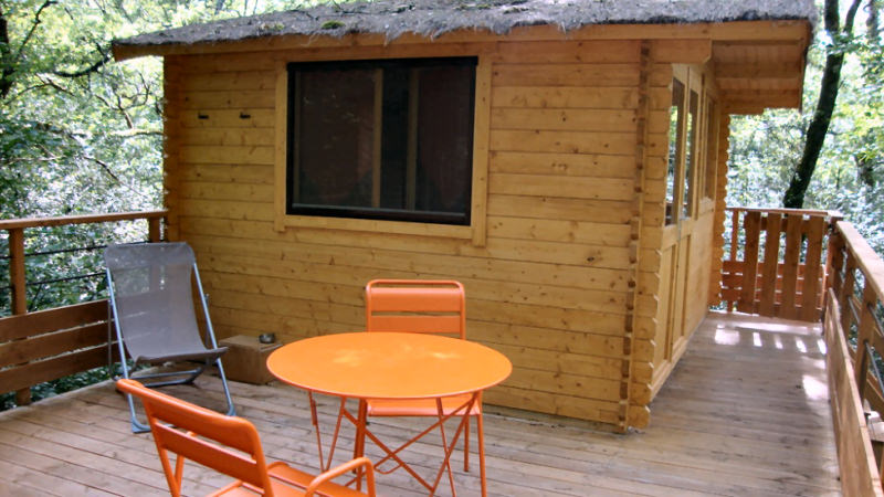 Cabane de 12 m² construite autour d'un chêne a plus de 6 m du sol. Vous apprécierez la vue plongeante sur le ruisseau et ses alentours grâce à sa terrasse de 8 m² où vous pourrez savourer le petit déjeuner.